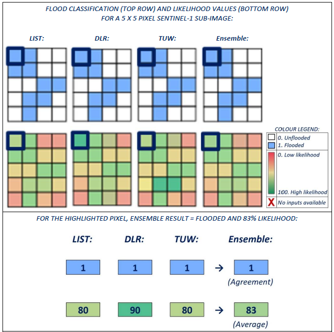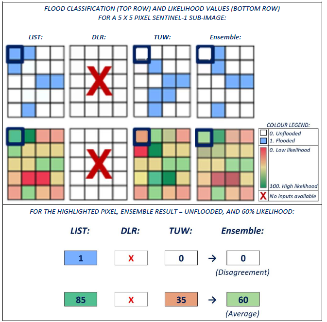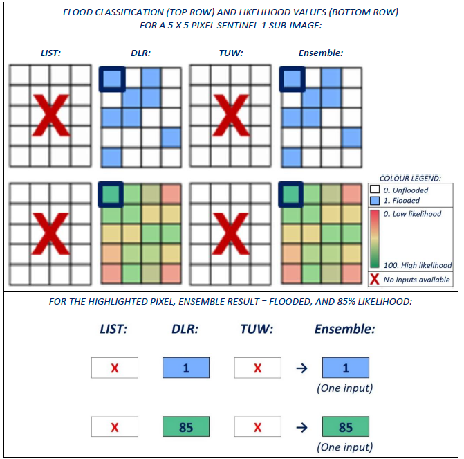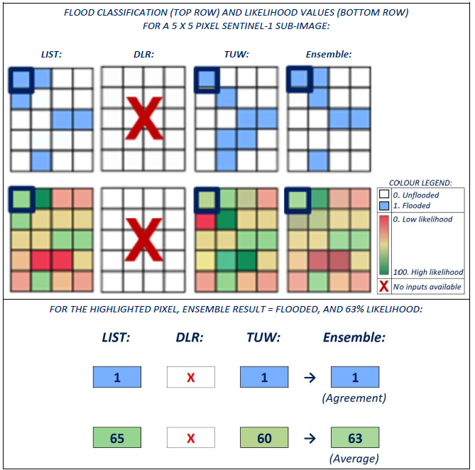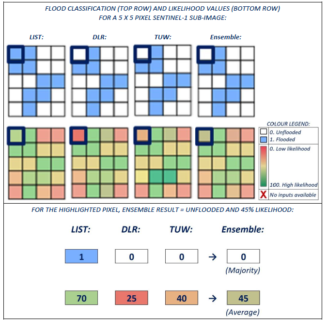 Table 18: The ten possible cases of classifying a grid-cell with the GFM Ensemble flood mapping algorithm, using a majority-based consensus (i.e. ratio > 0.5).