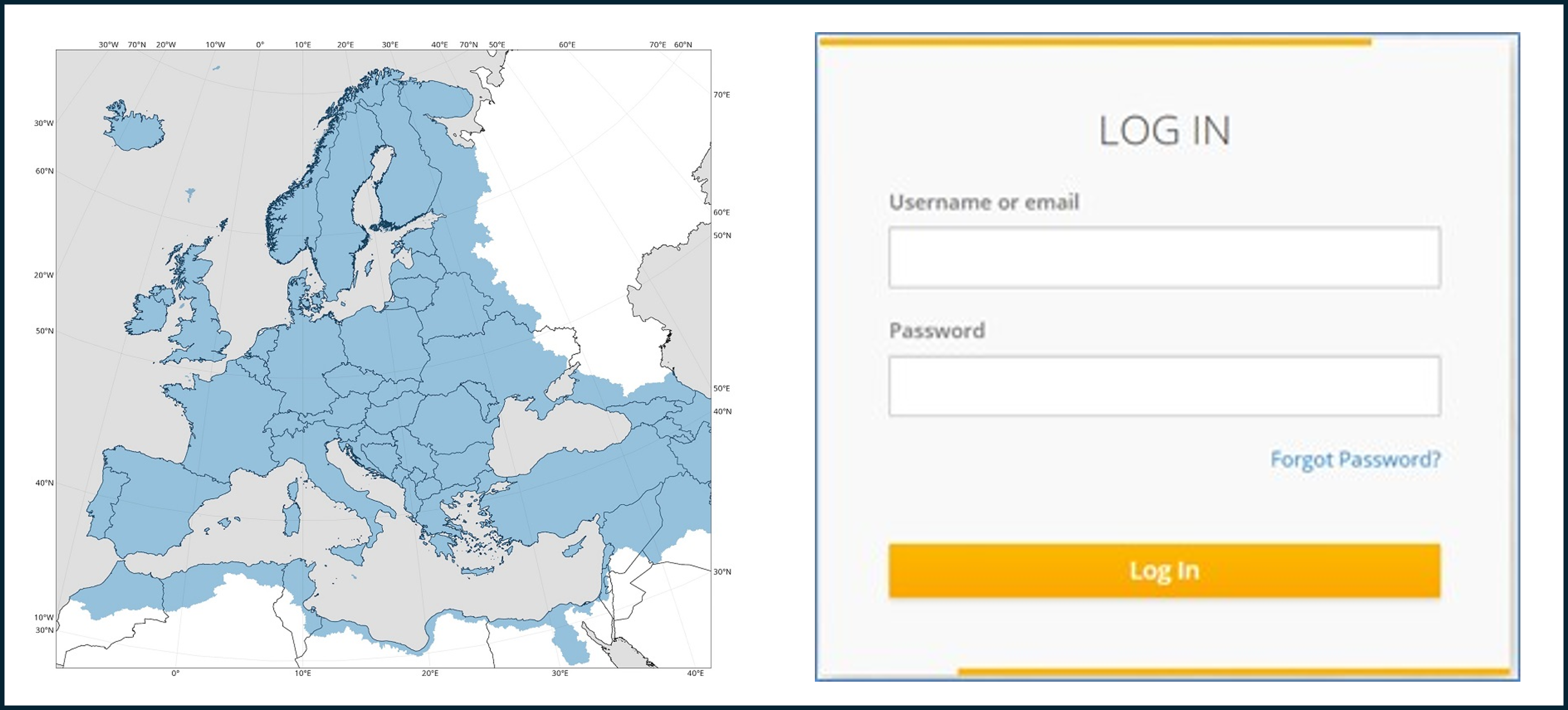 The European Flood Awareness System (EFAS) is the flood service of CEMS and is an operational system for monitoring and forecasting floods across the pan-European domain (left graphic below). GFM output layers are available through the EFAS Map Viewer. To access the Map Viewer and to visualise the products in real-time, users are requested to become EFAS partners. (See the terms and conditions of the association agreement). Once registered, the Map Viewer can be accessed by entering account details (right graphic below).
