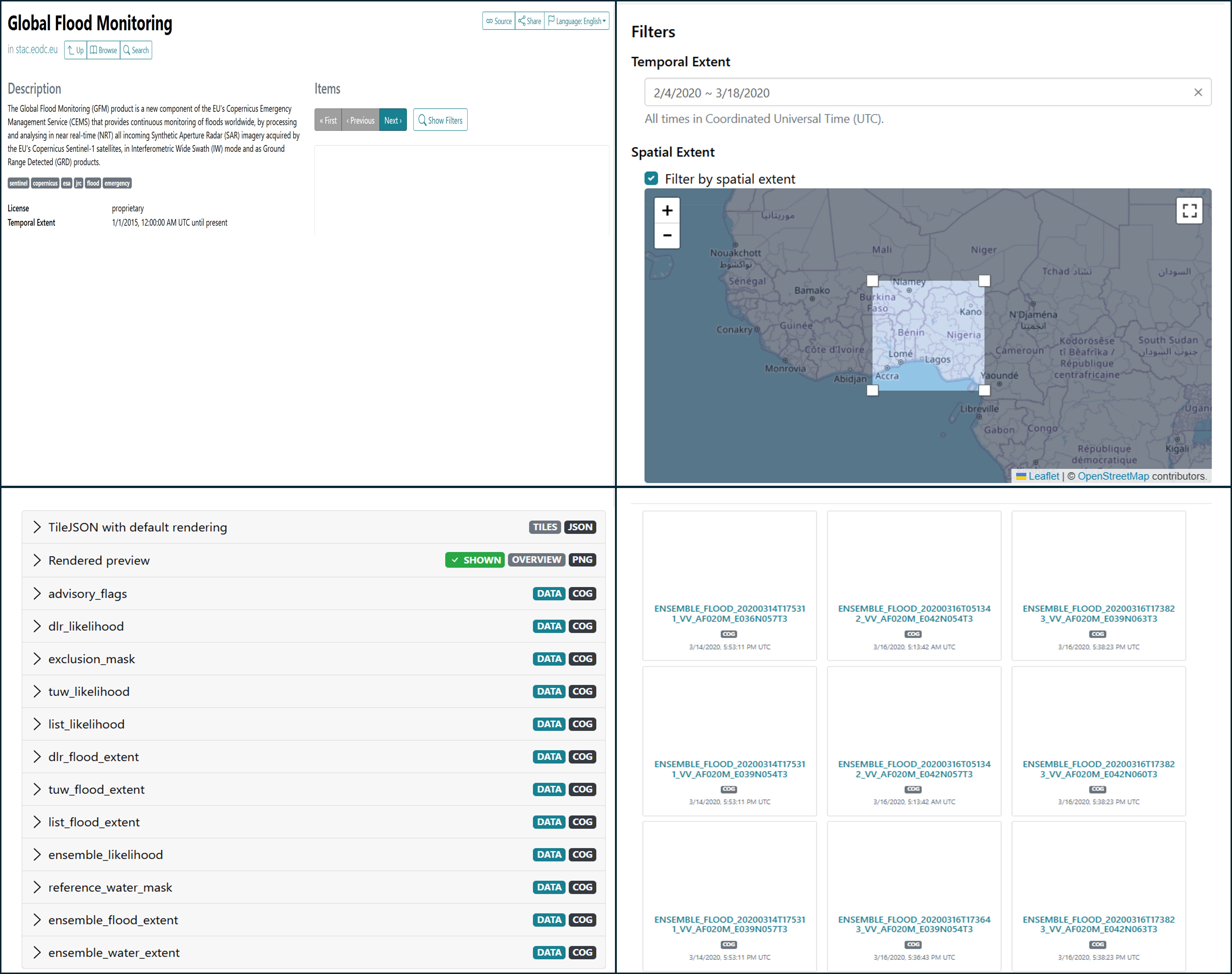 | 4. By clicking on one of the retrieved scenes, all of the related assets (i.e. geospatial datasets) stored in the GFM STAC catalogue are listed (bottom right graphic below), including the intermediate products (e.g. the observed flood extent detected by each individual GFM flood mapping algorithm). |