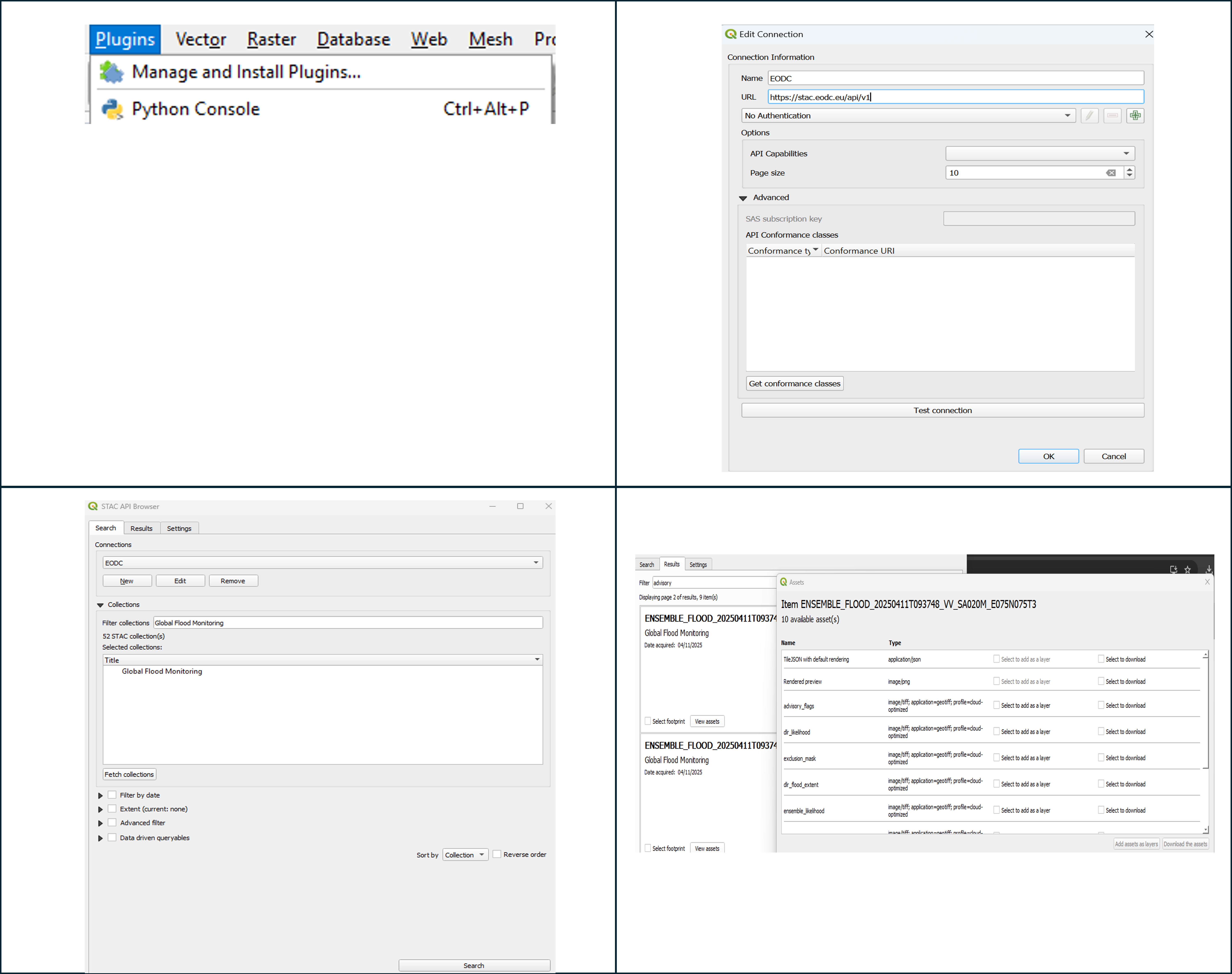| 1. The EODC Catalogue stores all Sentinel-1 scenes. Request the latest data in the GFM STAC catalogue via the EODC STAC Catalogue browser (top left graphic below). |