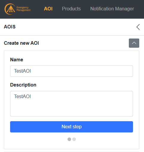 The AOI dashboard enables users to create and manage their AOIs. To create an AOI, first select “AOI” in the main banner (top graphic below) and then insert a “Name” and “Description” for the AOI and click “Next Step” (bottom graphic below).