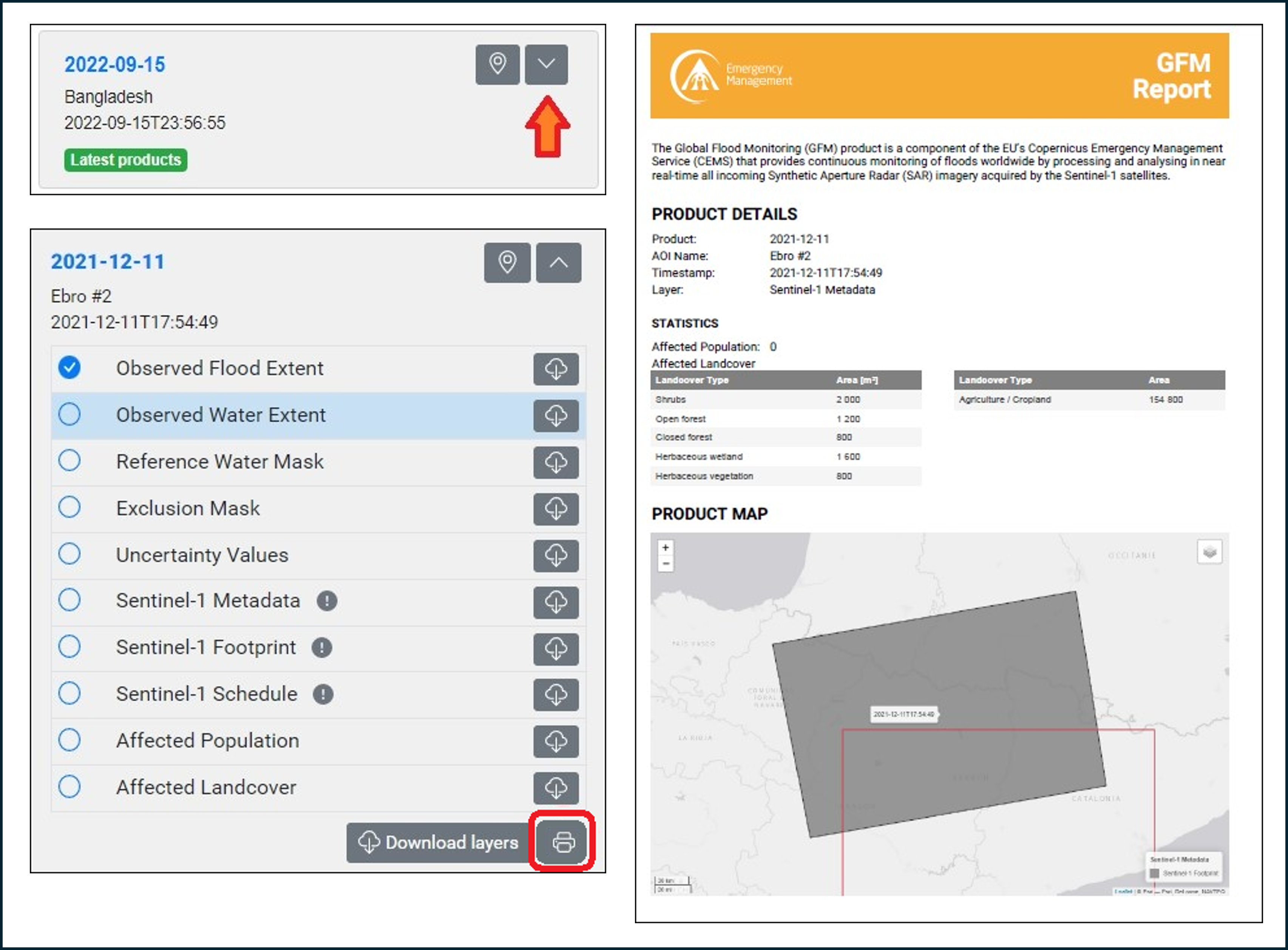 | 1. To generate a short report for a selected GFM output layer, the user opens the list of GFM output layers (top left graphic below, red arrow), selects an output layer (bottom left graphic below), and clicks “printer” button (bottom left graphic below, red circle). |