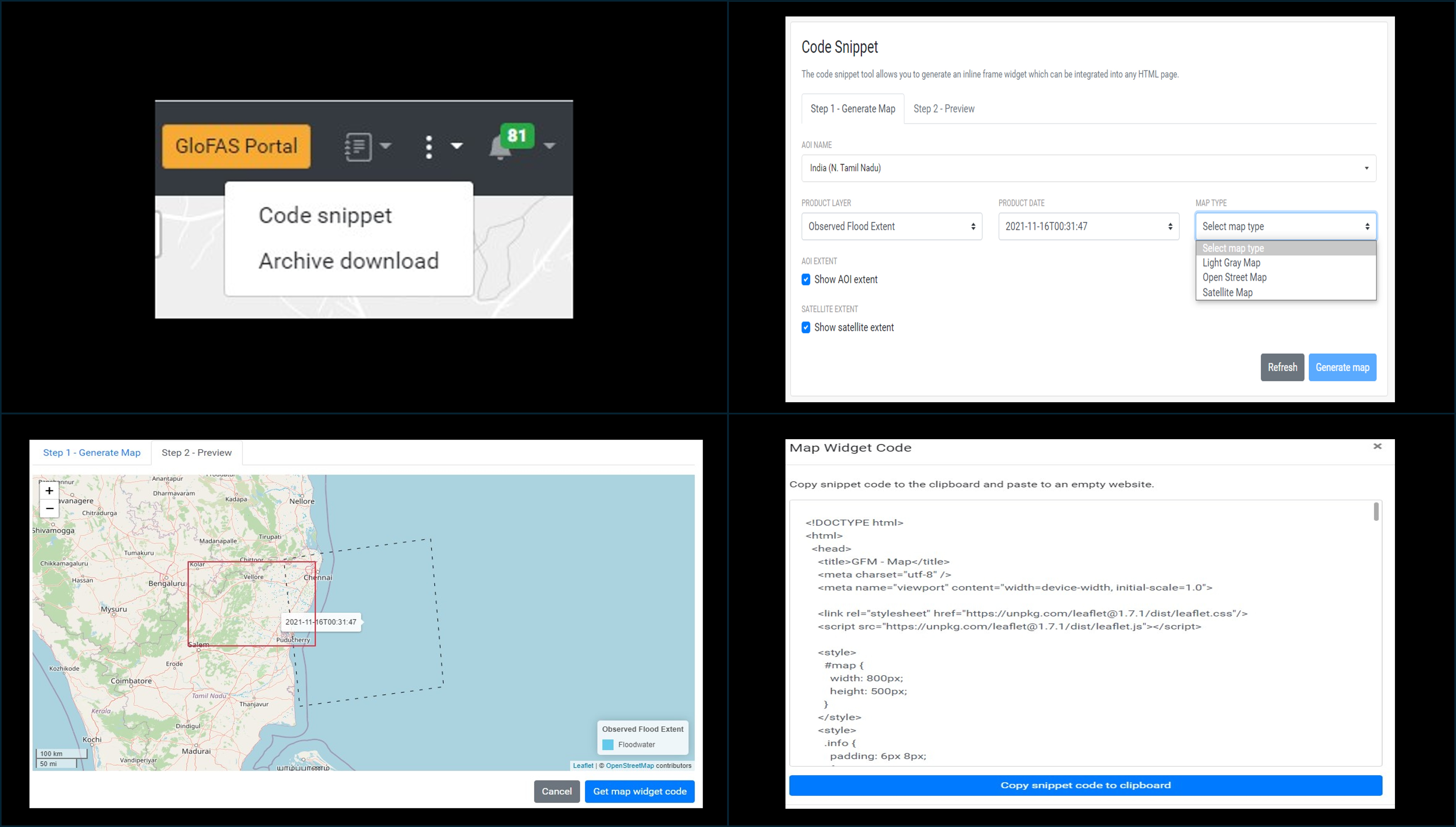 | 4. If the generated map fulfils the requirements, users can ingest it as a widget code by copying it into their HTML code (bottom right graphic below). |