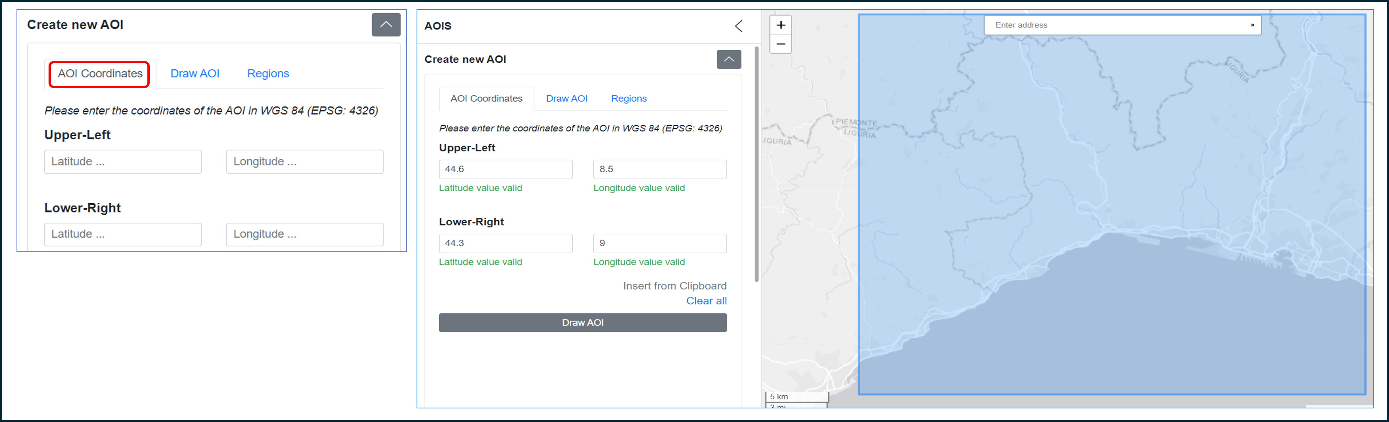 Select the "AOI Coordinates" button, enter the upper-left and lower-right latitude and longitude coordinates of the AOI, and click another button, for example “Draw AOI” (left graphic below). The system will display the selection on the map (right graphic below). Save the AOI (using the “Save AOI” button) to add the AOI to the list of AOIs.