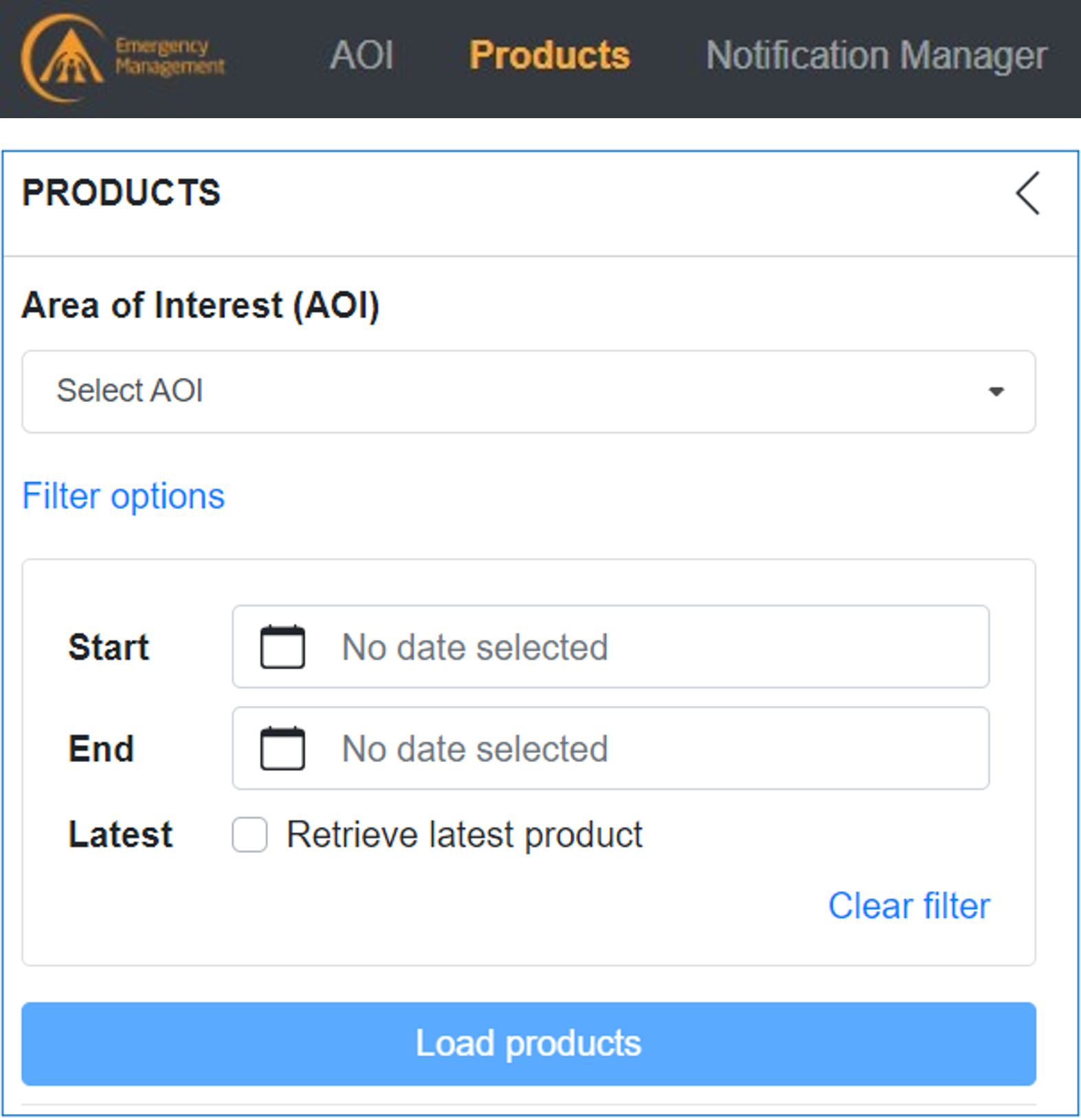 To download the GFM output layers, first select “Products” in the main banner (top graphic below), which brings up the Products form (bottom graphic below).