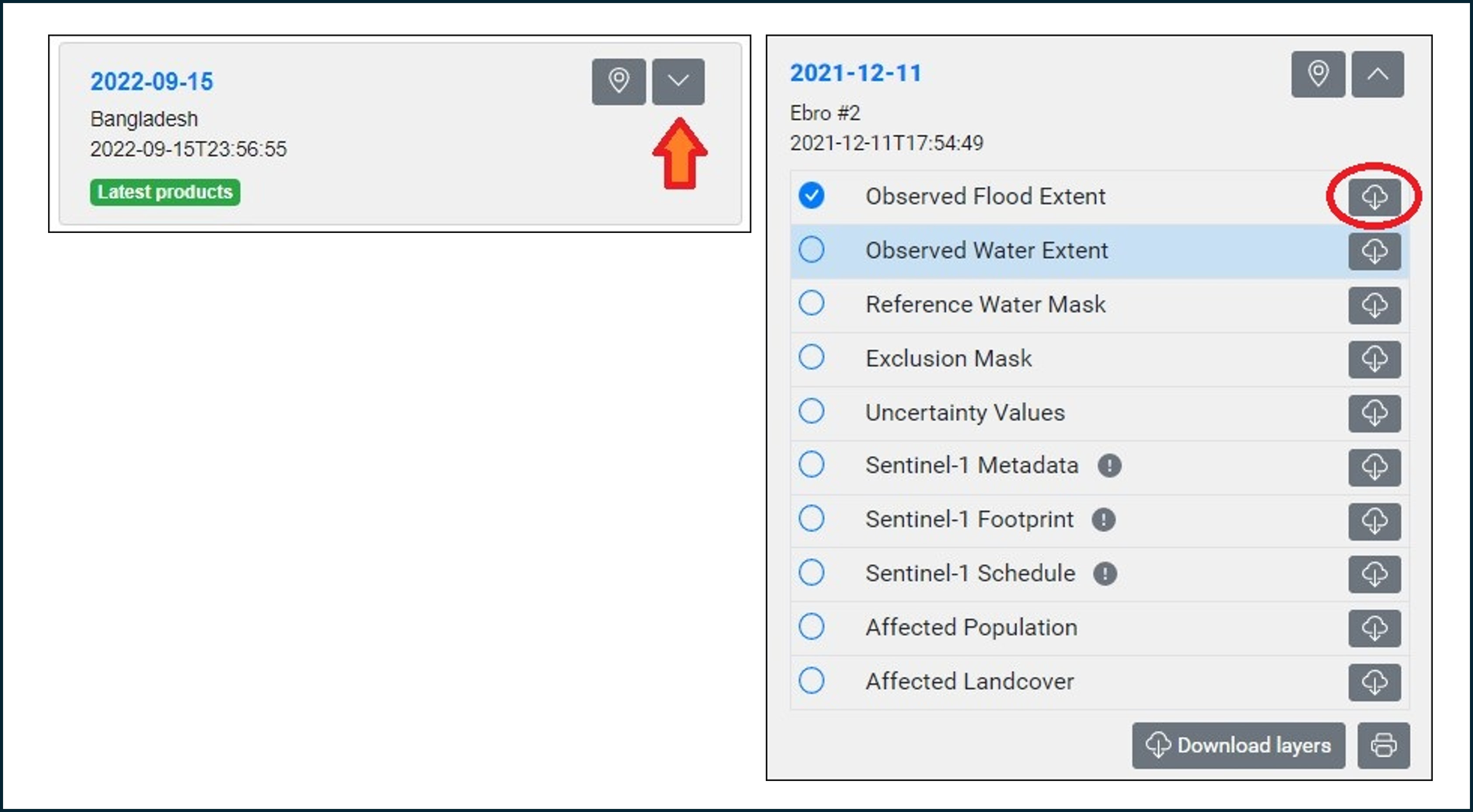 To download a single GFM output layer, users must click on a specific product (left graphic below, red arrow), select the output layer (right graphic below), and click Download (right graphic below, red circle). Note: (a) the length of the selected time-frame cannot be longer than 6 months; (b) this feature is not available if "Retrieve latest product" filter was ticked.