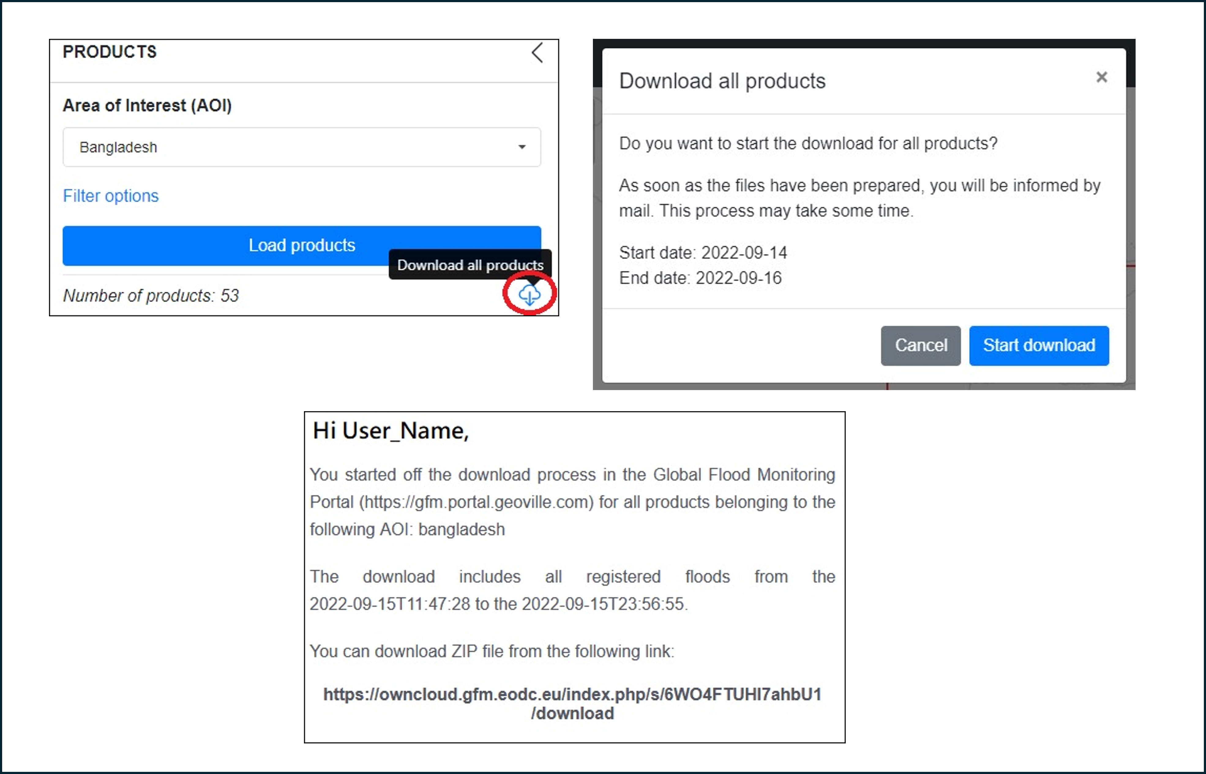 | 1. If multiple dates are available, users can download all GFM output layers for all dates, by clicking on the button “Download all products” (top left graphic below, red circle). |